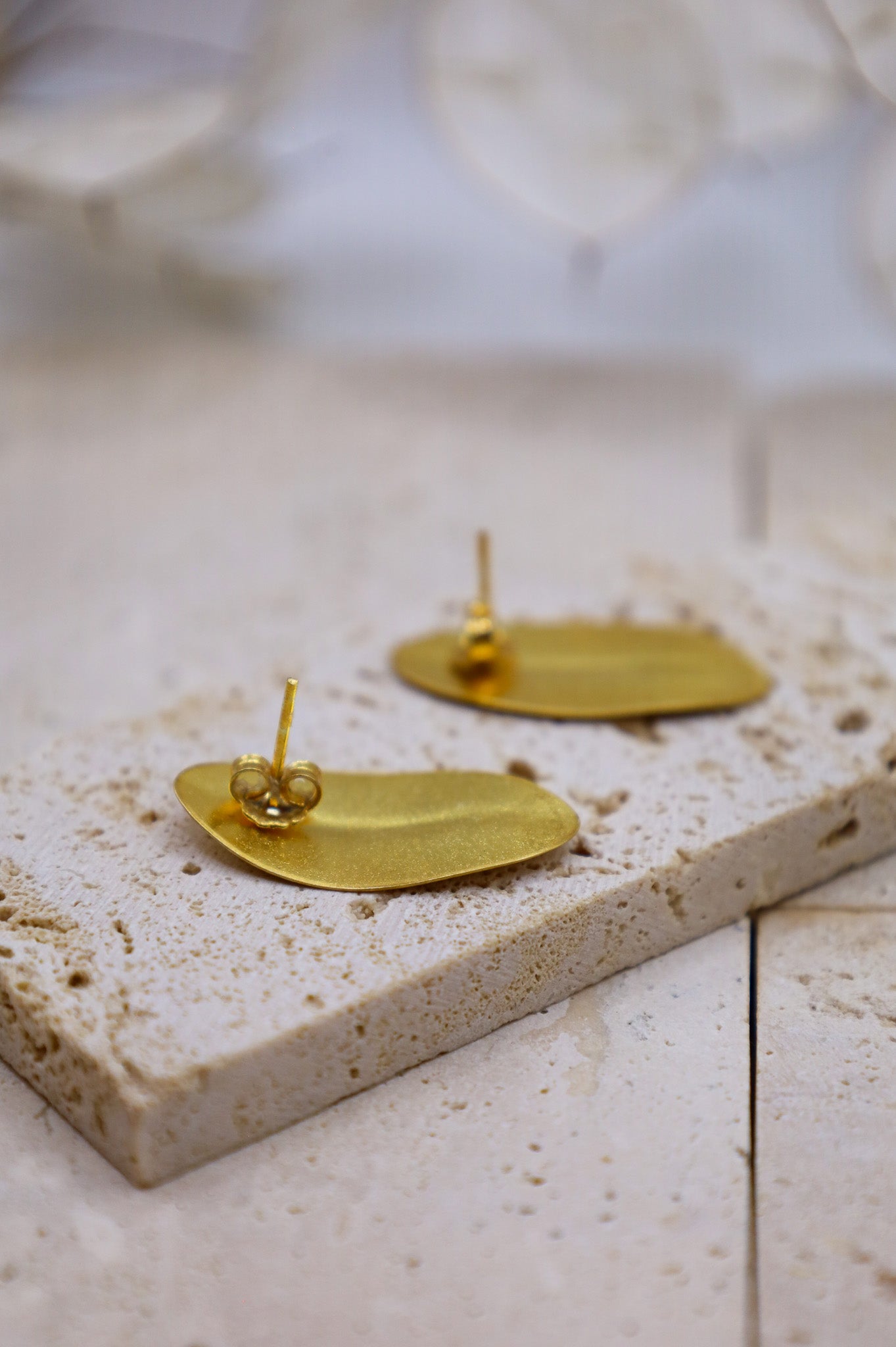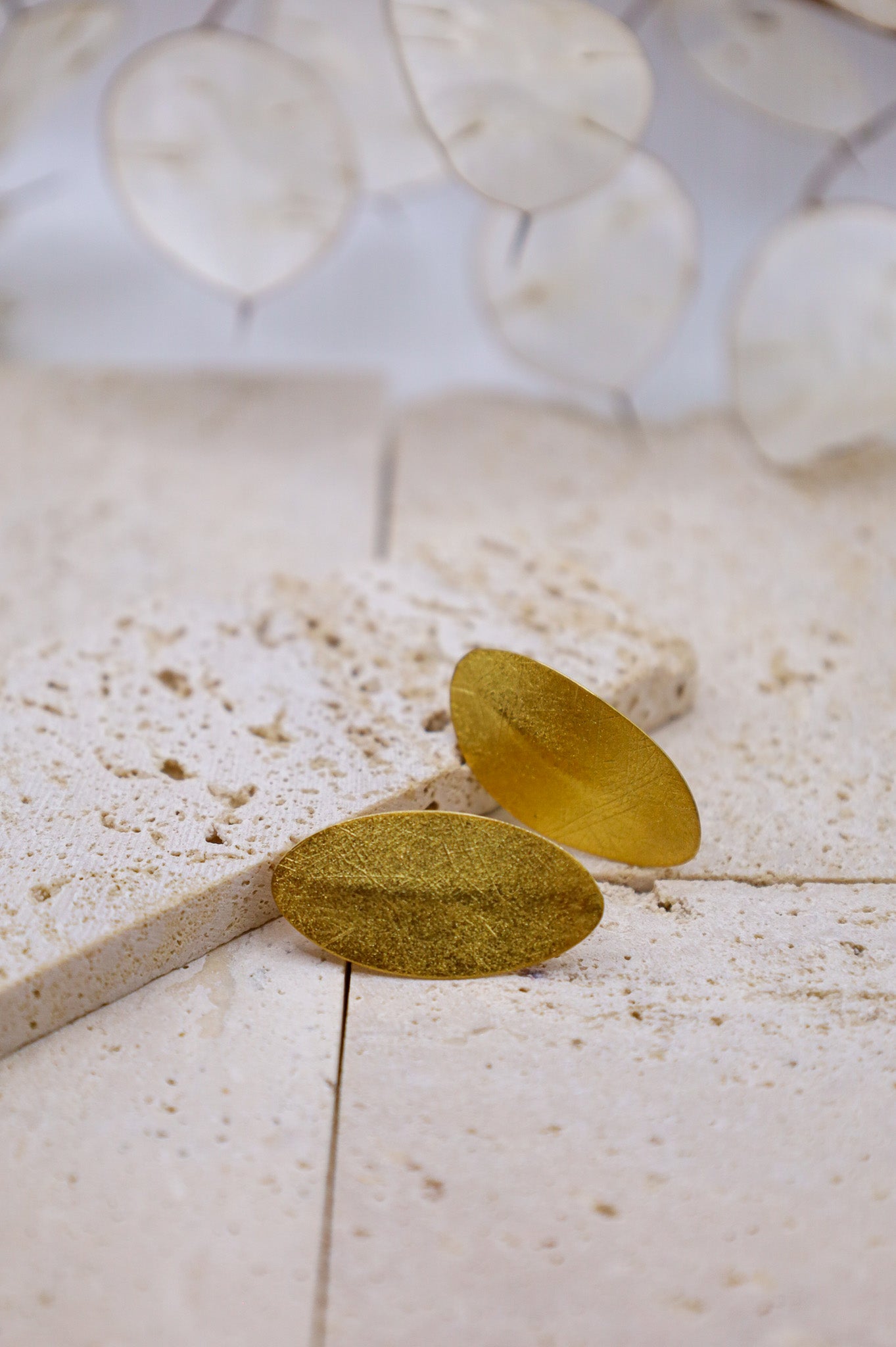 Setzen Sie ein luxuriöses Statement mit diesen atemberaubenden goldenen Ohrringen. Inspiriert von der natürlichen Schönheit organischer Formen, präsentieren sich diese Ohrringe in einer eleganten, blattähnlichen oder ovalen Wölbung, die das Licht auf einzigartige Weise einfängt.
