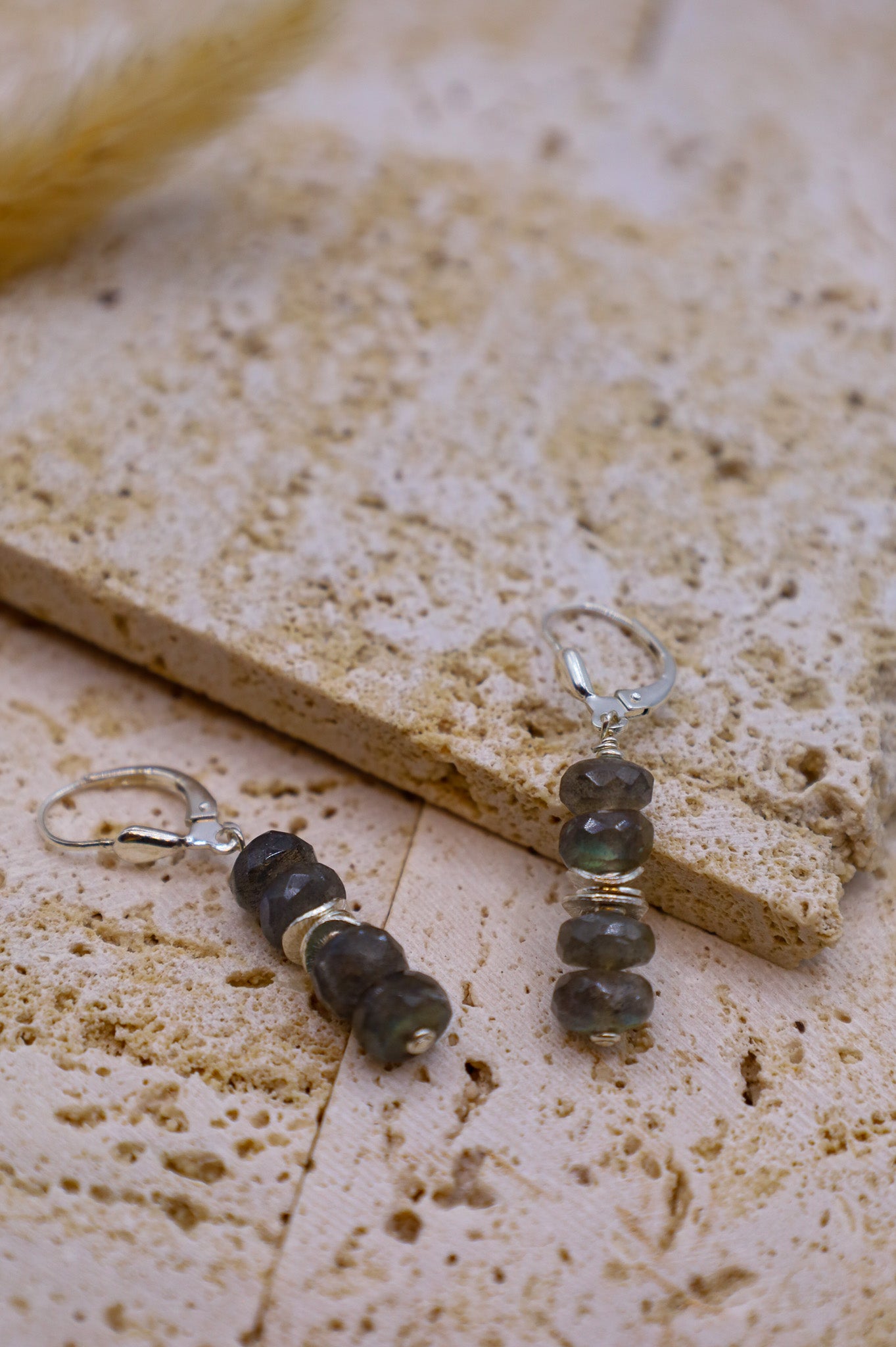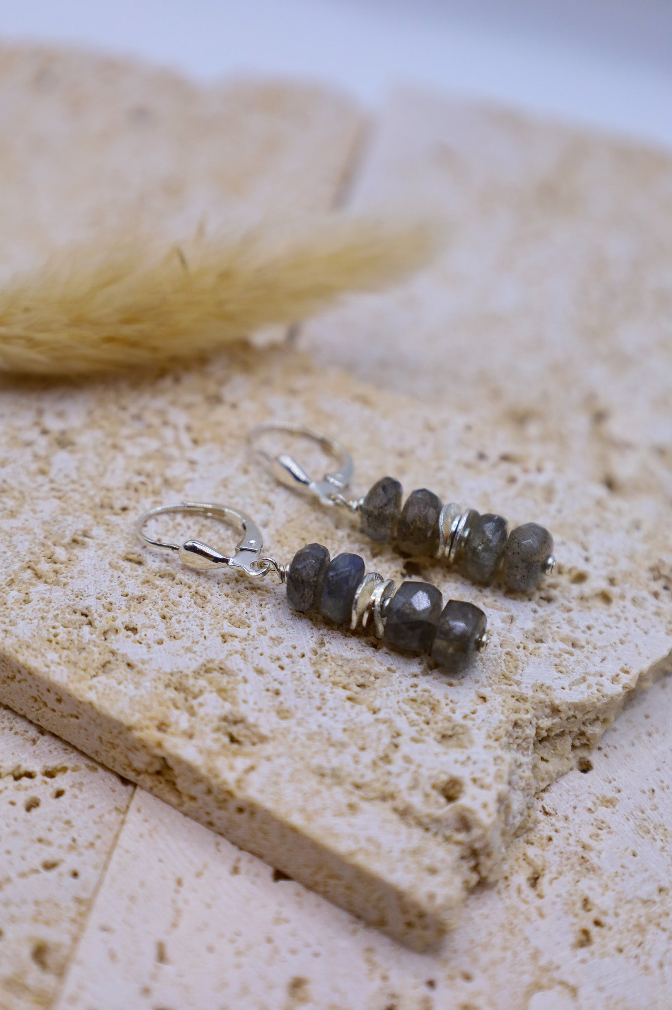 Die Ohrringe präsentieren jeweils fünf facettierte Labradorit-Perlen (Durchmesser ca. 6 mm), die durch filigrane Silber-Elemente akzentuiert werden. Mit einer Gesamtlänge von ca. 4 cm schwingen sie sanft bei jeder Bewegung und fangen das Licht in immer neuen Facetten ein. Gefertigt aus hochwertigem 925er Sterling Silber, bieten die klassischen Silberhaken einen sicheren Halt und höchsten Tragekomfort für empfindliche Ohren.