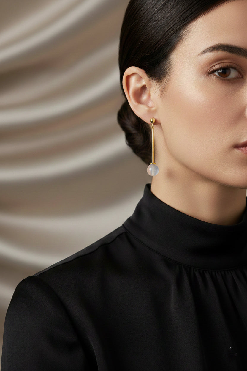 Diese hochwertigen Ohrringe mit Mondstein vereinen feine Materialien und modernes Design. Die zarten Röhrchen-Elemente aus vergoldetem Silber unterstreichen die natürliche Ausstrahlung des Steins und sorgen für eine feminine, elegante Note.