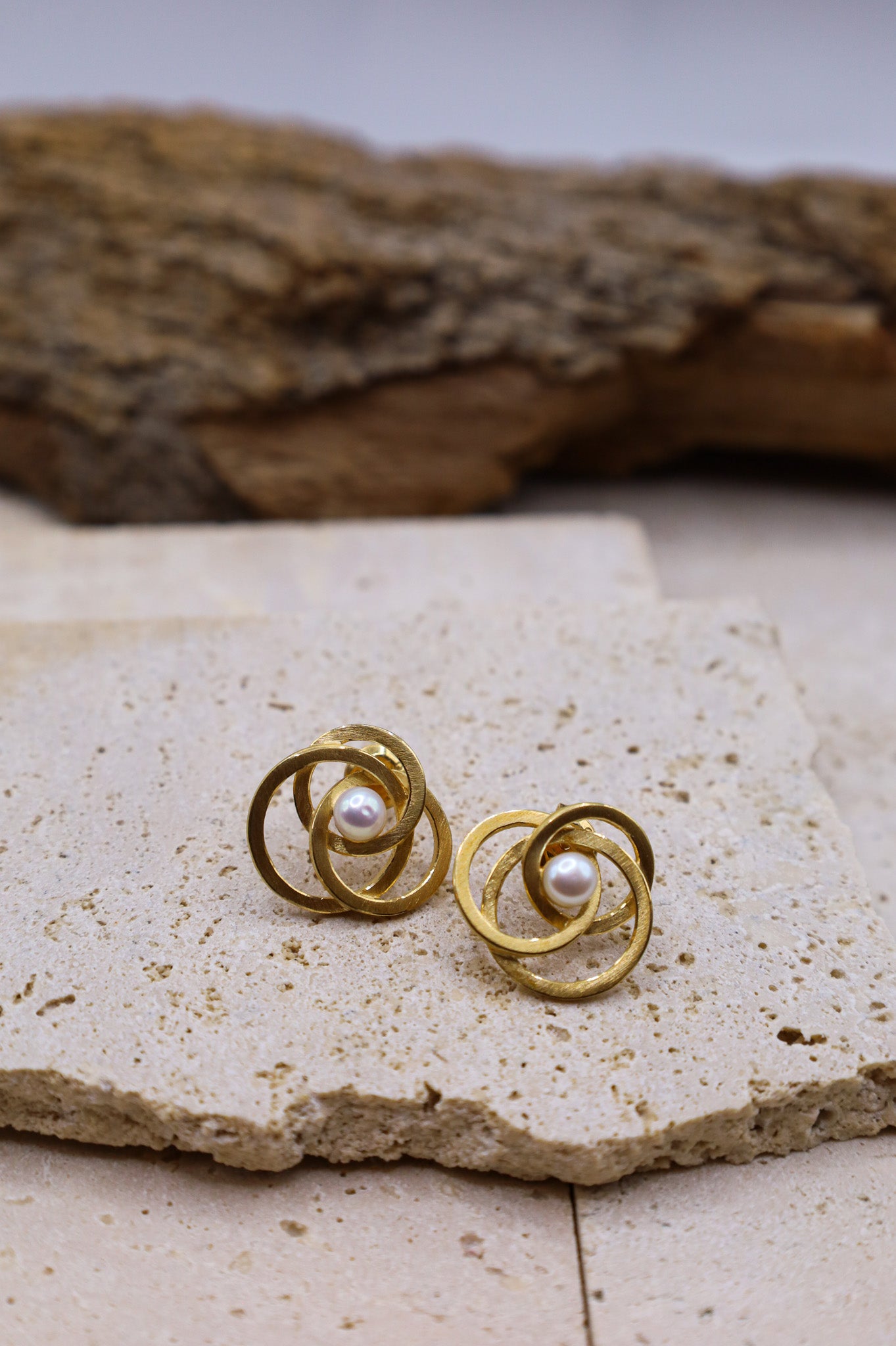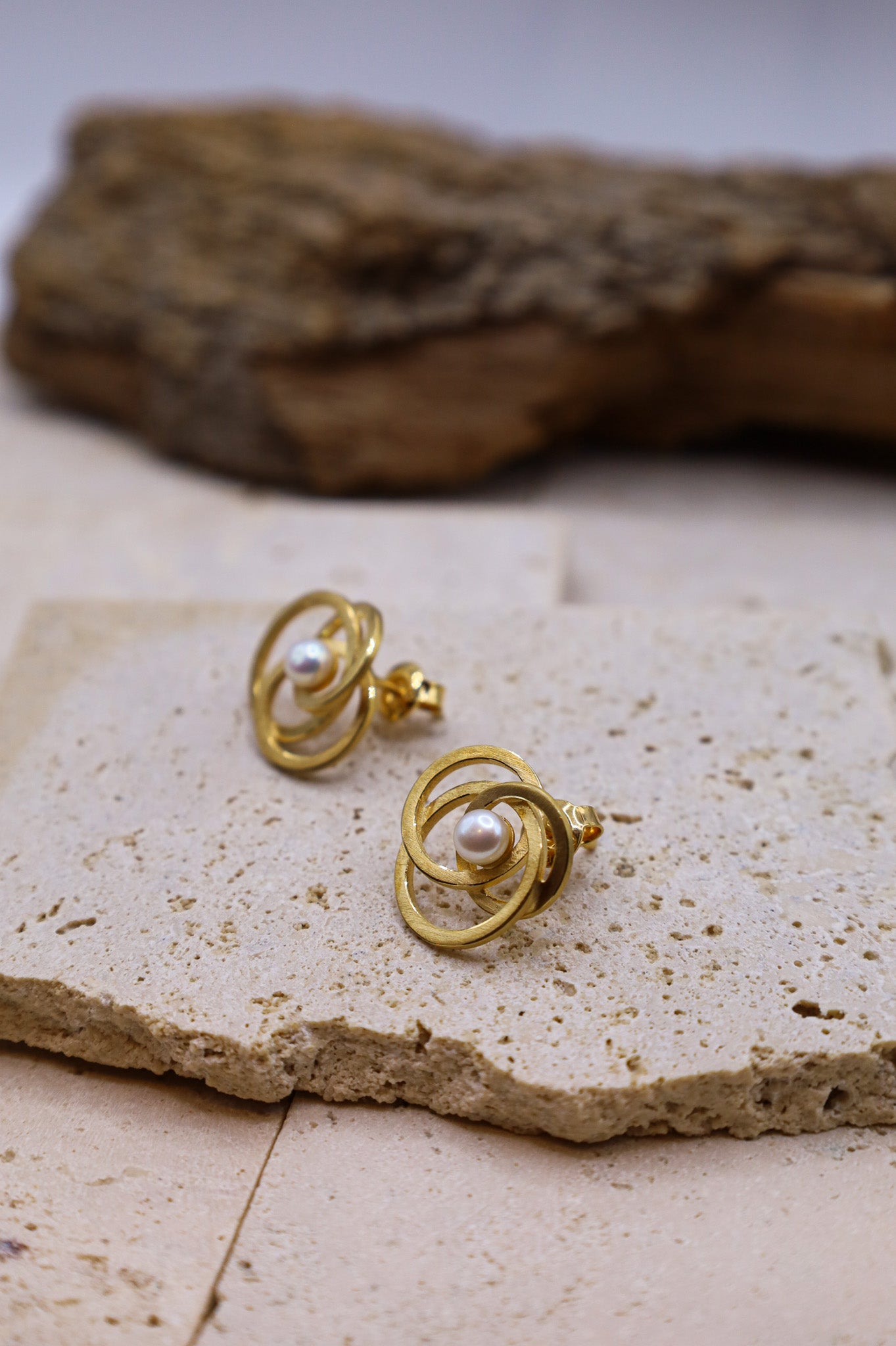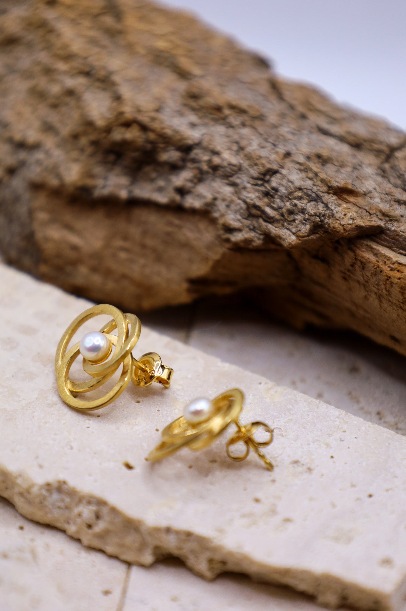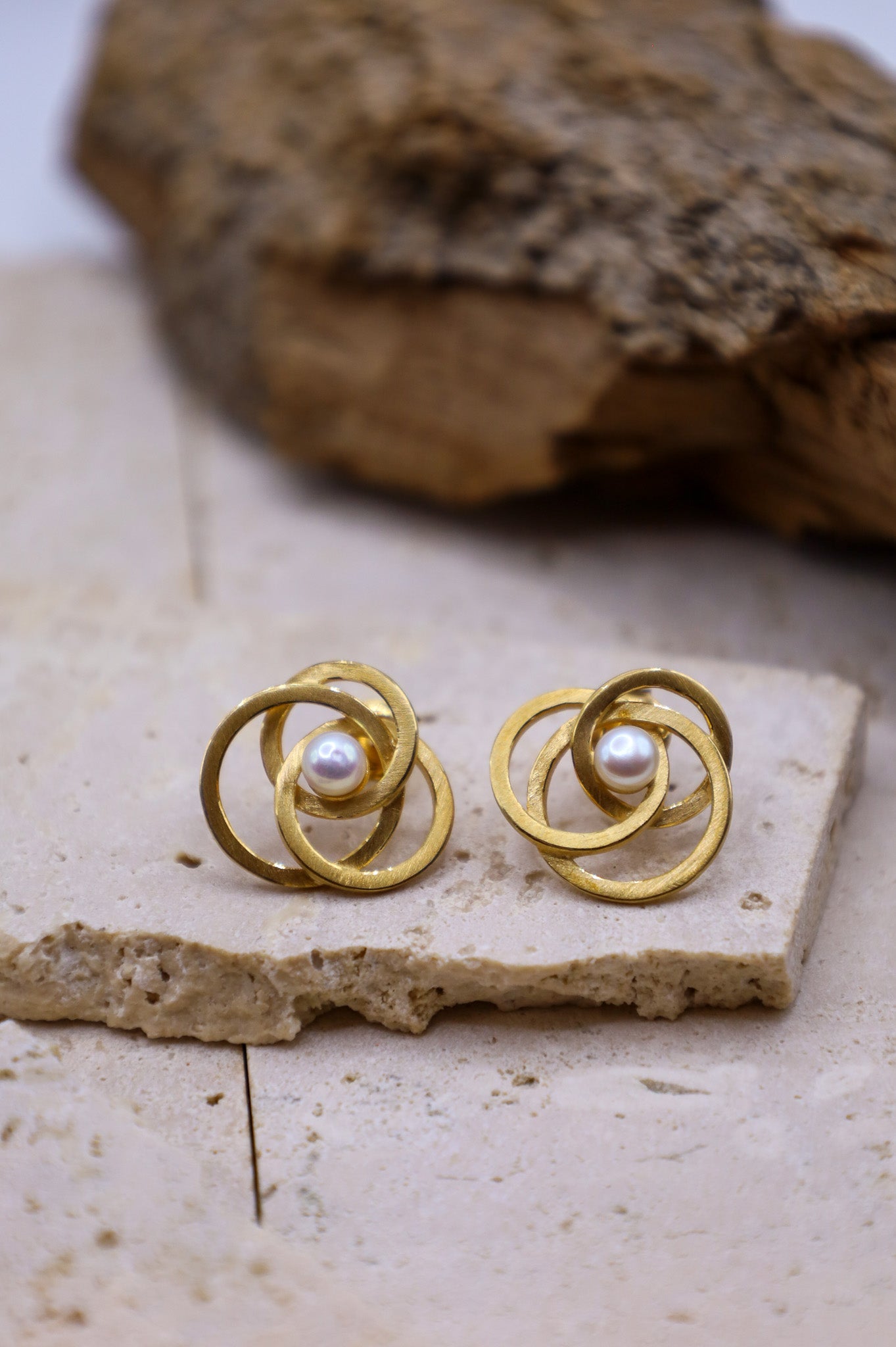 Drei ineinandergreifende, goldfarbene Ringe erzeugen eine komplexe, blütenartige Form, die durch die zentrale, schimmernde Perle vollendet wird. Die leicht matte Oberfläche der Ringe, gefertigt aus hochwertigem 925er Sterling Silber mit Echtgold-Vergoldung, sorgt für ein raffiniertes Finish, das nicht blendet.