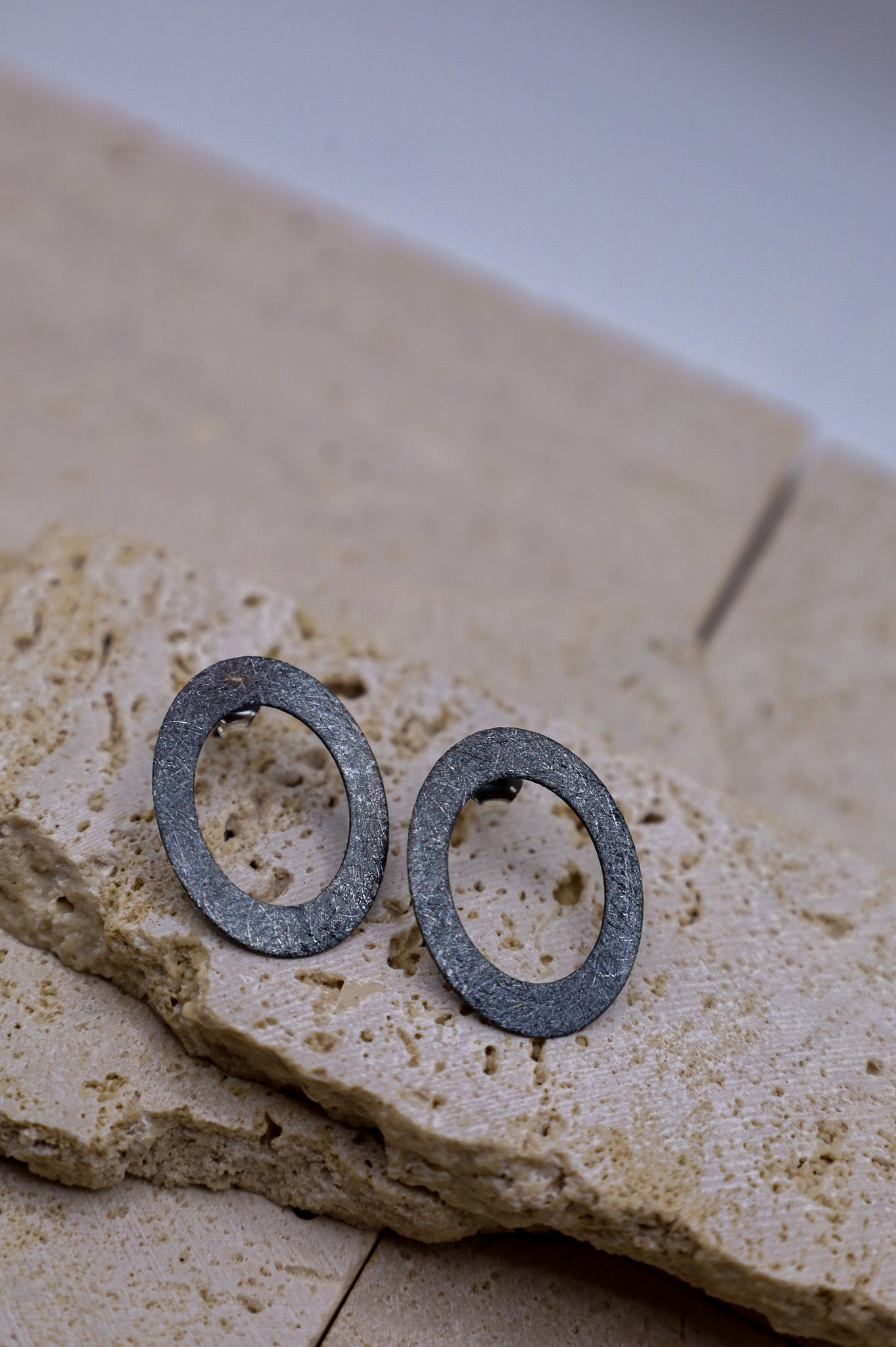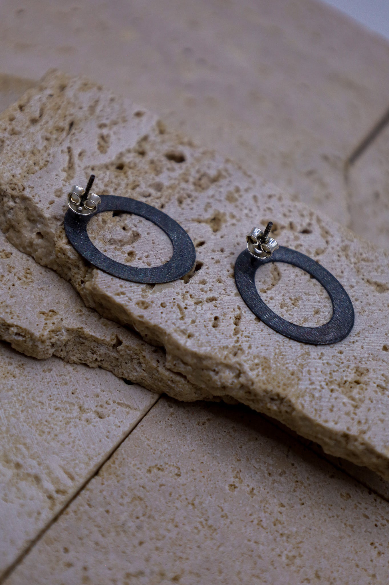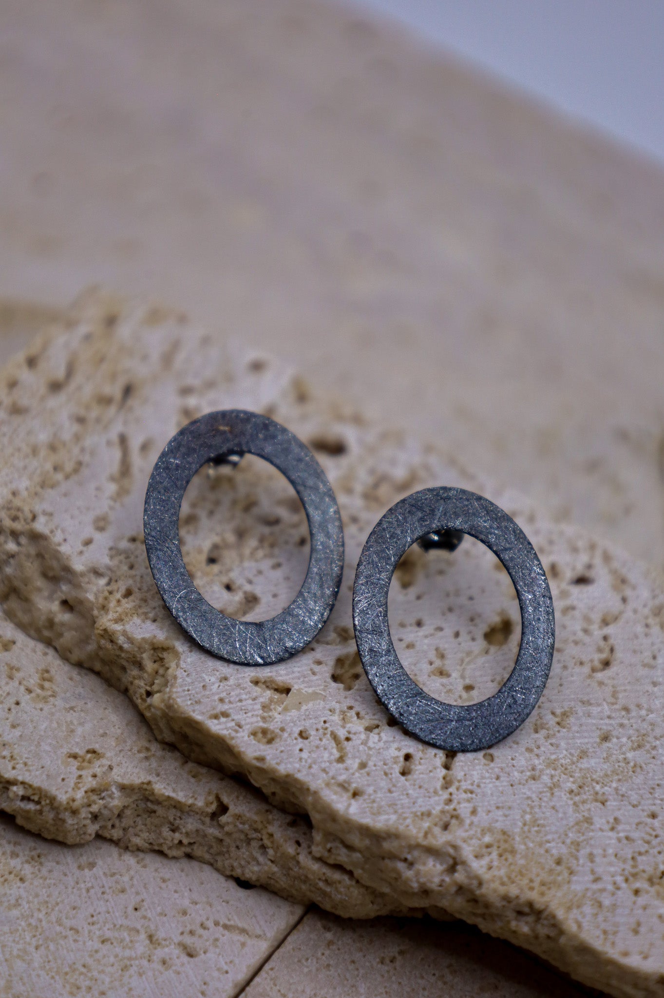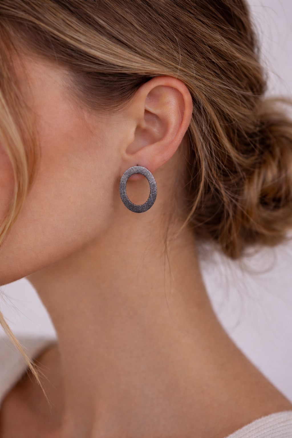 Die Oberfläche dieser ovalen Silberohrringe wurde speziell gebürstet. Dadurch erhält das Metall eine edle, matte Textur und das tiefe Finish des oxidierten 925er Sterling Silbers kommt besonders zur Geltung. Die gebürstete Optik verleiht dem Schmuckstück eine hochwertige Haptik und einen spannenden Kontrast zu glänzendem Schmuck.