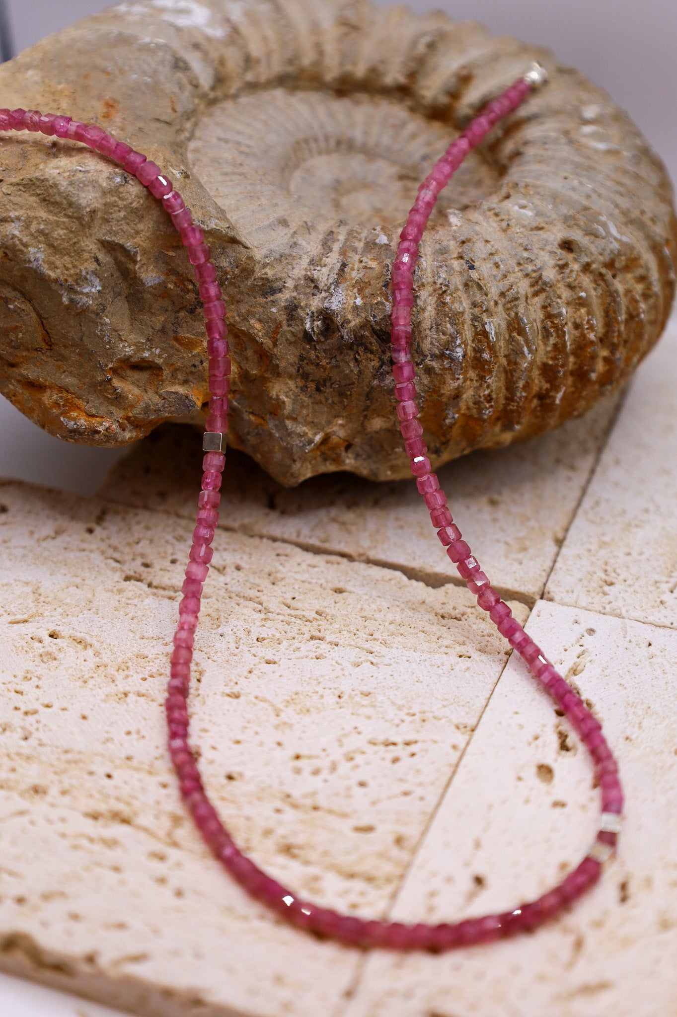 Das Besondere an diesem Turmalin Schmuck ist der unkonventionelle Schliff. Während klassische Perlen oft rund sind, setzen wir hier auf markante Quadrat-Turmalin Steine (ca. 3 mm). Diese geometrische Form verleiht der Kette eine architektonische Ästhetik. Zwischen den intensiv gefärbten Edelsteinen setzen kleine silberne Quadrate rhythmische Glanzpunkte, die das Licht bei jeder Bewegung einfangen.